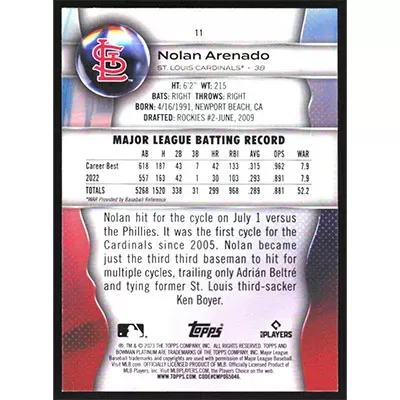 This is a 2023 Bowman Platinum Nolan Arenado baseball card. The card is #11 and pictures show condition.