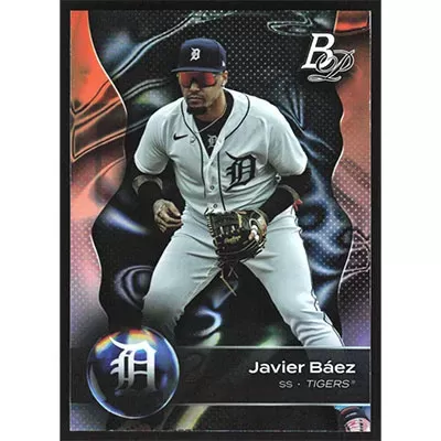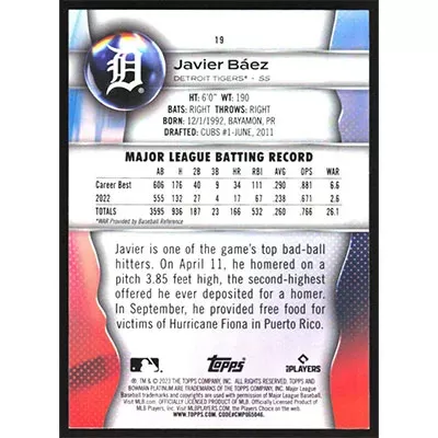 This is a 2023 Bowman Platinum Javier Baez baseball card. The card is #19 and pictures show condition.