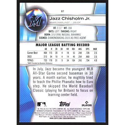 This is a 2023 Bowman Platinum Jazz Chisholm Jr. baseball card. The card is #87 and pictures show condition.