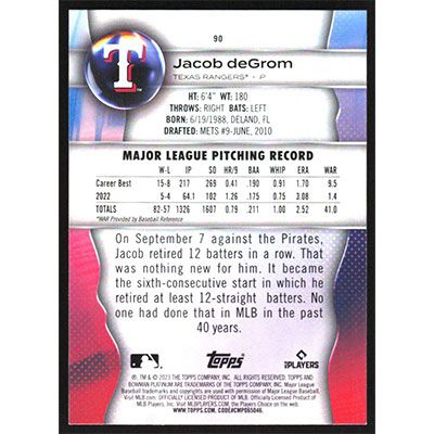 This is a 2023 Bowman Platinum Jacob deGrom baseball card. The card is #90 and pictures show condition.