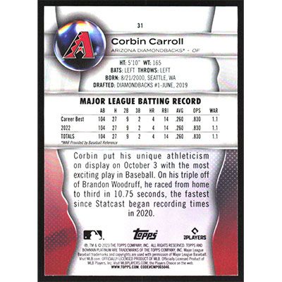 This is a 2023 Bowman Platinum Ice Corbin Carroll baseball card. The card is #31 and pictures show condition. Team(s): Arizona Diamondbacks Rookie Card (RC)