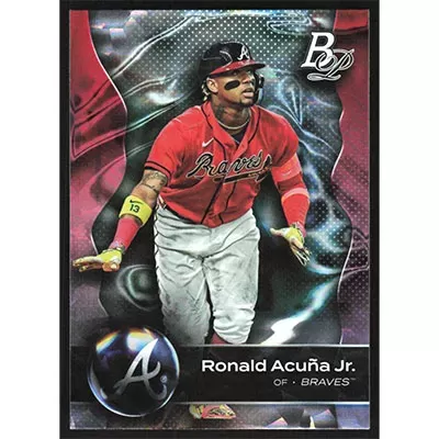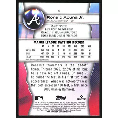 This is a 2023 Bowman Platinum Ice Foil Ronald Acuña Jr. baseball card. The card is #47 and pictures show condition.