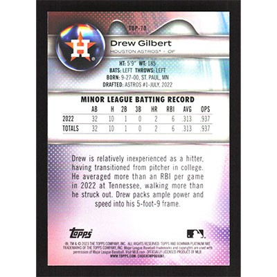 This is a 2023 Bowman Platinum Top Prospects Ice Foil Drew Gilbert baseball card. The card is #TOP-70 and pictures show condition. Team(s): Houston Astros