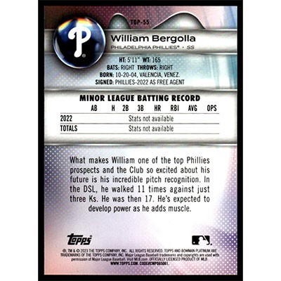 This is a 2023 Bowman Platinum Top Prospects William Bergolla baseball card. The card is #TOP-55 and pictures show condition. Team(s): Philadelphia Phillies