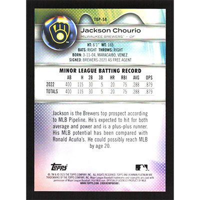 This is a 2023 Bowman Platinum Top Prospects Jackson Chourio baseball card. The card is #TOP-58 and pictures show condition.