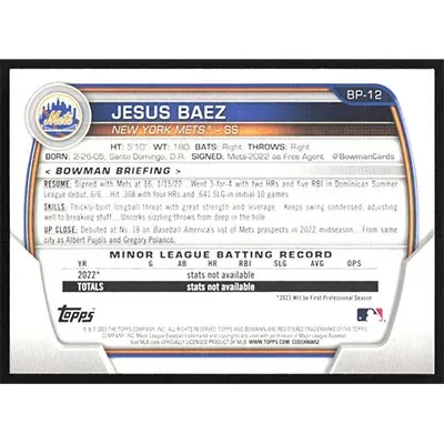 This is a 2023 Bowman Prospects Jesus Baez baseball card. The card is #BP-12 and pictures show condition.