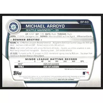 This is a 2023 Bowman Prospects Michael Arroyo baseball card. The card is #BP-63 and pictures show condition.