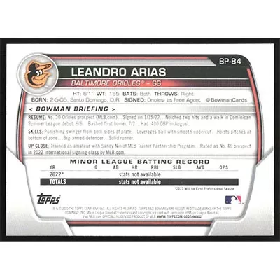 This is a 2023 Bowman Prospects Leandro Arias baseball card. The card is #BP-84 and pictures show condition.