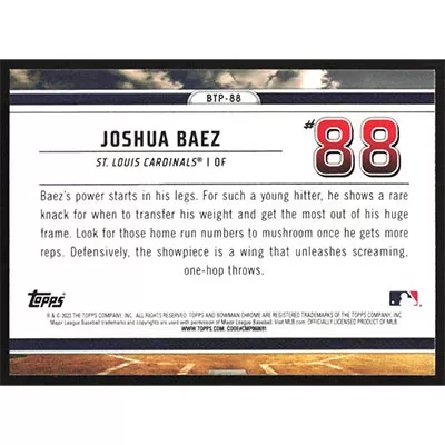 This is a 2023 Bowman Scouts Top 100 Joshua Baez baseball card. The card is #BTP-88 and pictures show condition.