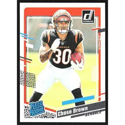 This is a 2023 Donruss Chase Brown Rated Rookie football card. The card is #318 and pictures show condition. Team(s): Cincinnati Bengals Rookie Card (RC)