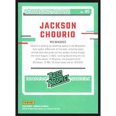 This is a 2023 Donruss Holo Carolina Blue Jackson Chourio Rated Prospect baseball card. The card is #85 and pictures show condition. Team(s): Milwaukee Brewers