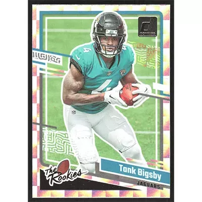 This is a 2023 Donruss The Rookies Tank Bigsby football card. The card is #28 and pictures show condition.