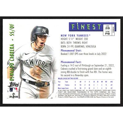 This is a 2023 Finest Flashbacks Oswaldo Cabrera baseball card. The card is #28 and pictures show condition. Team(s): New York Yankees Rookie Card (RC)