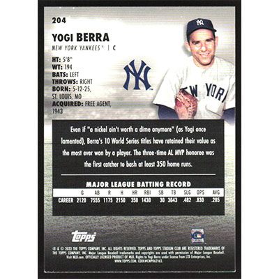 This is a 2023 Stadium Club Yogi Berra baseball card. The card is #204 and pictures show condition.