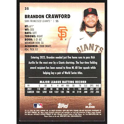 This is a 2023 Stadium Club Brandon Crawford baseball card. The card is #35 and pictures show condition.
