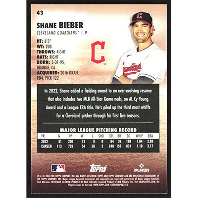 This is a 2023 Stadium Club Shane Bieber baseball card. The card is #43 and pictures show condition.