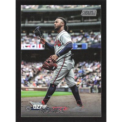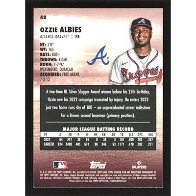 This is a 2023 Stadium Club Ozzie Albies baseball card. The card is #48 and pictures show condition.