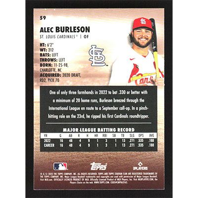 This is a 2023 Stadium Club Alec Burleson baseball card. The card is #59 and pictures show condition.
