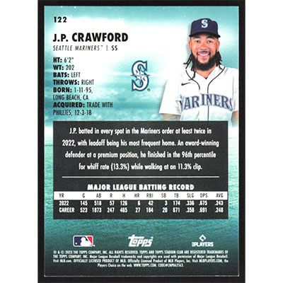 This is a 2023 Stadium Club Red Foil J.P. Crawford baseball card. The card is #122 and pictures show condition.