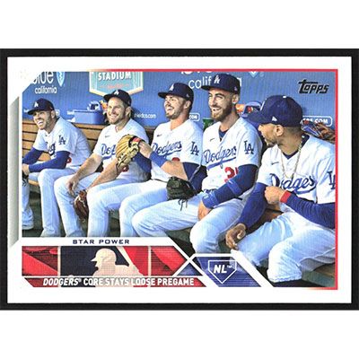 This is a 2023 Topps Freddie Freeman, Max Muncy, Gavin Lux, Cody Bellinger and Mookie Betts Checklist Star Power baseball card. The card is #113 and pictures show condition.