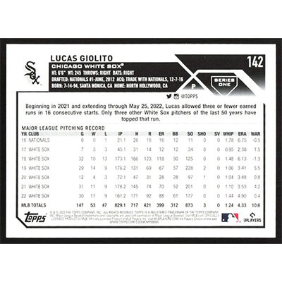This is a 2023 Topps Lucas Giolito baseball card. The card is #142 and pictures show condition.