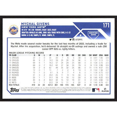This is a 2023 Topps Mychal Givens baseball card. The card is #171 and pictures show condition.
