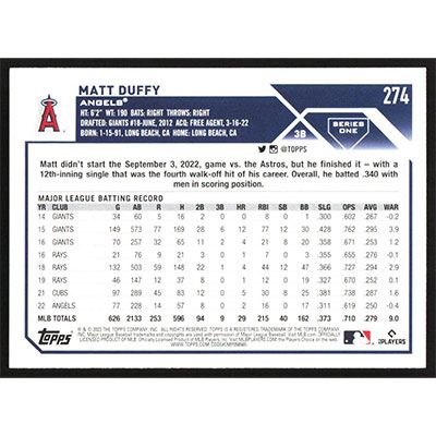 This is a 2023 Topps Matt Duffy baseball card. The card is #274 and pictures show condition.