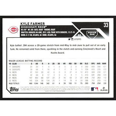 This is a 2023 Topps Kyle Farmer baseball card. The card is #33 and pictures show condition.
