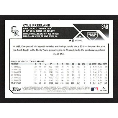 This is a 2023 Topps Kyle Freeland baseball card. The card is #348 and pictures show condition.