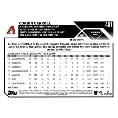 This is a 2023 Topps Corbin Carroll baseball card. The card is #401 and is in NM-MT condition.
