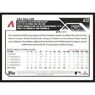 This is a 2023 Topps Zac Gallen baseball card. The card is #412 and pictures show condition.