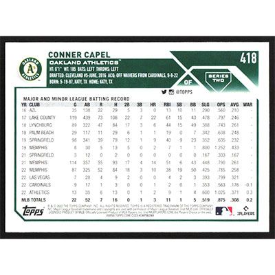 This is a 2023 Topps Conner Capel baseball card. The card is #418 and pictures show condition.