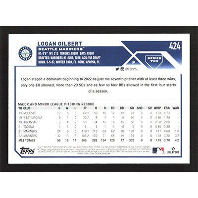 This is a 2023 Topps Logan Gilbert baseball card. The card is #424 and pictures show condition.