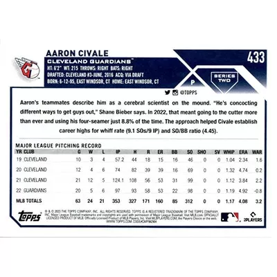 This is a 2023 Topps Aaron Civale baseball card. The card is #433 and is in NM-MT condition.