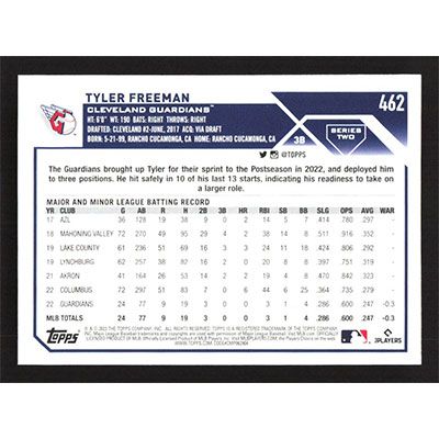 This is a 2023 Topps Tyler Freeman baseball card. The card is #462 and pictures show condition.