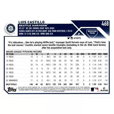 This is a 2023 Topps Luis Castillo baseball card. The card is #468 and is in NM-MT condition.