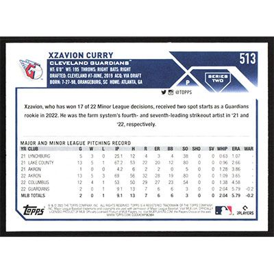 This is a 2023 Topps Xzavion Curry baseball card. The card is #513 and pictures show condition.