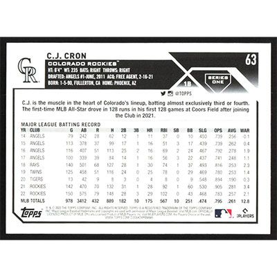 This is a 2023 Topps C.J. Cron baseball card. The card is #63 and pictures show condition.