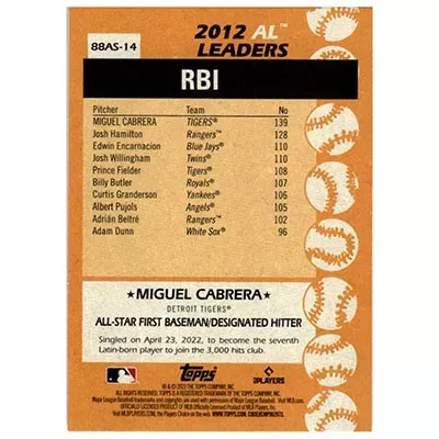 This is a 2023 Topps '88 All-Stars Miguel Cabrera baseball card. The card is #88AS-14 and is in NM-MT condition.