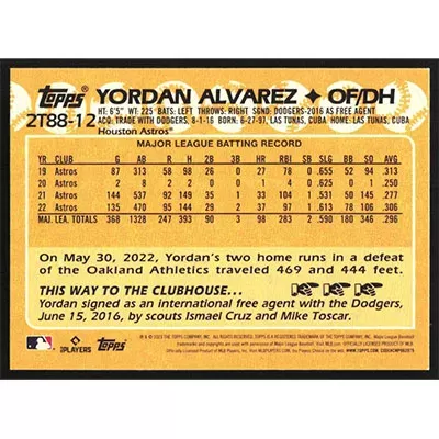 This is a 2023 Topps '88 Series 2 Yordan Alvarez baseball card. The card is #2T88-12 and pictures show condition.