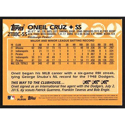 This is a 2023 Topps '88 Silver Pack Chrome Series 2 Oneil Cruz baseball card. The card is #2T88C-55 and pictures show condition. Team(s): Pittsburgh Pirates