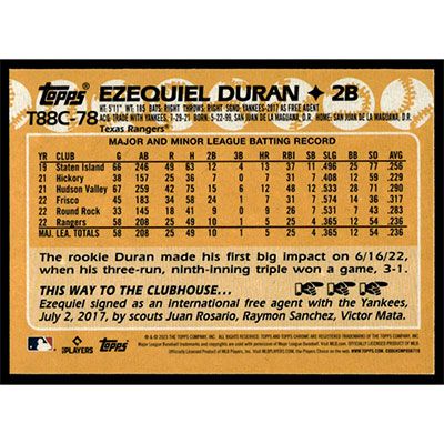 This is a 2023 Topps '88 Silver Pack Chrome Ezequiel Duran baseball card. The card is #T88C-78 and pictures show condition. Team(s): Texas Rangers Rookie Card (RC)