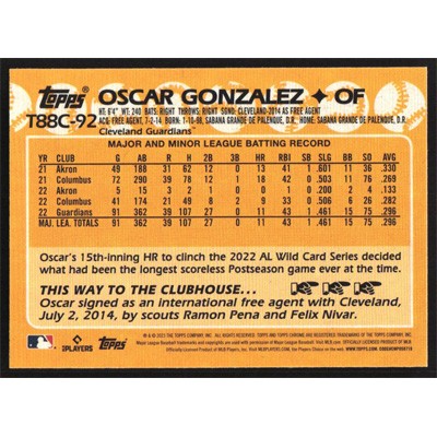 This is a 2023 Topps '88 Silver Pack Chrome Oscar Gonzalez baseball card. The card is #T88C-92 and pictures show condition.