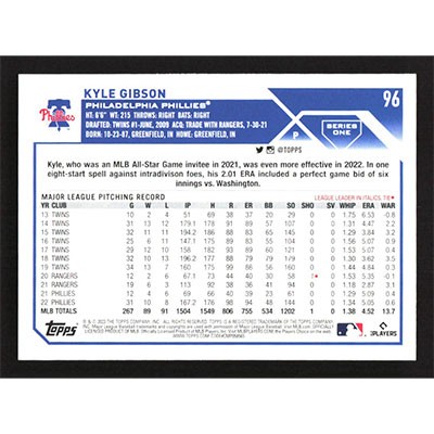 This is a 2023 Topps Kyle Gibson baseball card. The card is #96 and pictures show condition.