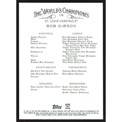 This is a 2023 Topps Allen & Ginter Bob Gibson baseball card. The card is #176 and pictures show condition.