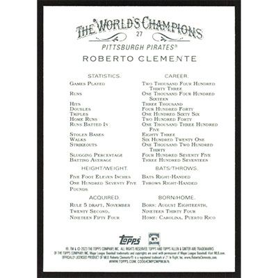 This is a 2023 Topps Allen & Ginter Roberto Clemente baseball card. The card is #27 and pictures show condition.
