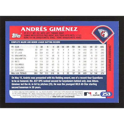 This is a 2023 Topps Archives Andres Gimenez baseball card. The card is #253 and pictures show condition.