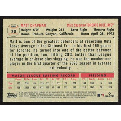 This is a 2023 Topps Archives Matt Chapman baseball card. The card is #70 and pictures show condition.