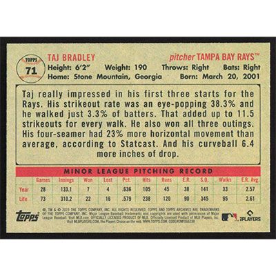 This is a 2023 Topps Archives Taj Bradley baseball card. The card is #71 and pictures show condition.