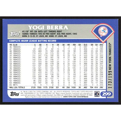 This is a 2023 Topps Archives Rainbow Yogi Berra baseball card. The card is #299 and pictures show condition. This card is limited; #'d 173/199. Team(s): New York Yankees
